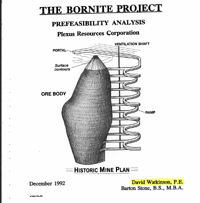 - Anfang der 1990er Jahre plante Plexus eine unterirdische Kupfermine mit einer Kapazität von 1.400 Tonnen pro Tag (tpd) und einer Konzentrierungsanlage mit einer Kapazität von 1.000 tpd sowie einer Lebensdauer von etwa 8 Jahren. Es ist zu beachten, dass derzeit bei Bornite keine Mineralressourcen oder -reserven abgegrenzt sind, die den Standards NI 43-101 und CIM entsprechen.